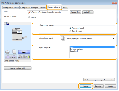 ![]() | Para imprimir en el papel especificado, indique el origen del papel cargado con el papel que desea utilizar. |