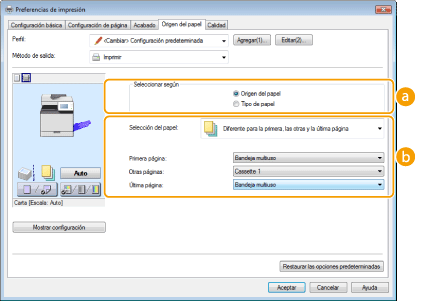 Puede imprimir páginas específicas de un documento, como por ejemplo, si desea imprimir la portada de un cuadernillo en papel a color. En este caso, cargue papel a color para la portada en la bandeja multiuso, cargue papel normal para las páginas del cuerpo en el casete de papel y, a continuación, especifique las opciones de papel en el controlador de impresora. ![]() [Seleccionar según]Como en el ejemplo que se describe anteriormente, para utilizar papel específico en páginas específicas, seleccione [Origen del papel]. [Selección del papel]Seleccione cómo especificar papel, como [Diferente para la portada y las otras páginas]* o [Diferente para la primera, las otras y la última página]. Asimismo, especifique qué papel debe utilizarse en la portada y las páginas del cuerpo.