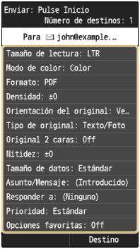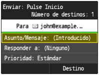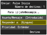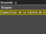 La dirección de respuesta no está establecida de forma predeterminada. Si desea notificar al destinatario la dirección de respuesta, especifique la dirección entre las direcciones registradas en la libreta de direcciones. Si no hay ninguna dirección registrada en la libreta de direcciones, consulte