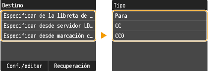 Utilice la libreta de direcciones o un servidor LDAP para los destinos <Para>. Para especificar los destinos para <CC> y <CCO>, necesita utilizar la libreta de direcciones y la marcación codificada.
