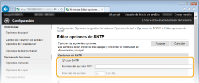 El SNTP del equipo admite servidores NTP (versión 3) y SNTP (versiones 3 y 4). |