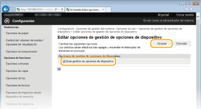 2 | Seleccione la casilla de verificación [Notificar] y especifique las opciones necesarias. ![]() [Notificar] Marque la casilla de verificación para informar a un software de administración de dispositivo del estado de energía del equipo. Si se selecciona [Notificar], el equipo evitará las comunicaciones innecesarias durante el modo de reposo y reducirá el consumo total de energía. [Número de puerto] Cambie el número de puerto de esta función según el entorno de red. [Número de enrutadores que puede atravesar] Especifique por cuántos routers pueden pasar los paquetes de notificaciones. Introduzca un número entre 0 y 254. [Intervalo de notificación] Especifique con qué frecuencia informará el equipo a un software de administración de dispositivos sobre su estado energético. Introduzca un número en segundos entre 60 y 65.535. |