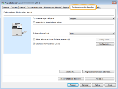 Haga clic en la pestaña [Configuraciones del dispositivo] y especifique las opciones necesarias.