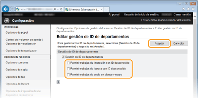 Para obtener información sobre las casillas de verificación [Permitir trabajos de impresión con ID desconocido]/[Permitir trabajos de lectura con ID desconocido]/[Permitir trab. de copia en B/N], consulte