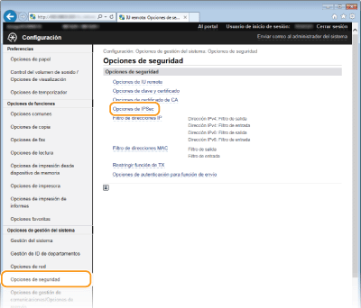 Puede activar o desactivar la comunicación IPSec en <Menú>. Usar IPSec |