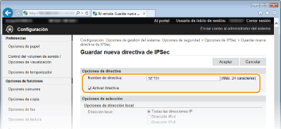 Si se selecciona [Opciones manuales de IPv4] o [Opciones manuales de IPv6] en [Dirección remota], introduzca la dirección IP para aplicar la directiva. También puede introducir un rango de direcciones insertando un guión entre las direcciones.