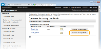 2 | Haga clic en [Guardar clave prefijada] en la parte derecha del par de claves que desee utilizar.  Visualización de los detalles de un par de claves o un certificadoPuede consultar los detalles del certificado o verificar el certificado haciendo clic en el vínculo de texto correspondiente que aparece debajo de [Nombre de clave], o el icono del certificado. Verificación de los pares de claves, claves de firma de dispositivos o certificados |