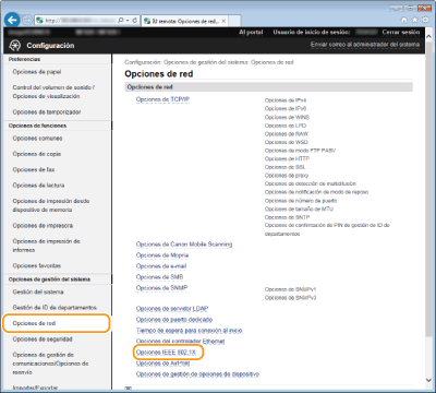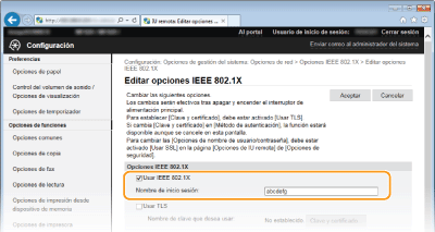 Seleccione la casilla de verificación [Usar IEEE 802.1X], introduzca el nombre de inicio de sesión en el cuadro de texto [Nombre de inicio sesión] y especifique las opciones necesarias.