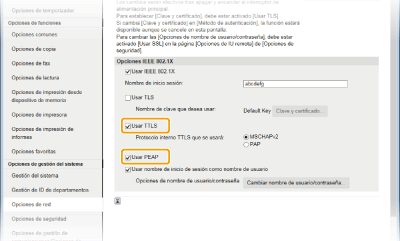 Las opciones necesarias son casi las mismas que las de TTLS. MS-CHAPv2 se utiliza como protocolo interno. Habilite TLS para la IU remota antes de configurar este método de autenticación (