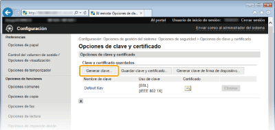 Los pares de claves pueden generarse con el equipo en caso necesario para la comunicación cifrada a través de la Capa de seguridad de transporte (Transport Layer Security, TLS). Puede utilizar TLS para acceder al equipo a través de la IU remota. Pueden registrarse hasta cinco pares de claves en el equipo.