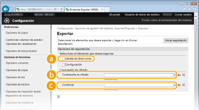 Puede guardar los datos de la libreta de direcciones registrados en el ordenador, o registrar los datos de la libreta de direcciones guardados en el equipo. Otros equipos pueden importar el contenido de registro exportado desde este equipo y viceversa*. * Es posible que no esté disponible en función del modelo. |