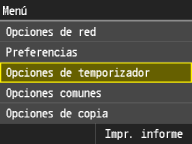 | | Todas las opciones sobre el temporizador se muestran con descripciones breves. Las opciones predeterminadas aparecen marcadas con una cruz (  ). |