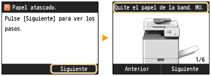 Si se produce un atasco de papel, <Papel atascado.> aparecerá en la pantalla. Pulse <Siguiente> para mostrar soluciones sencillas. Si le resulta difícil entender los procedimientos de la pantalla, consulte las siguientes secciones para eliminar atascos.
