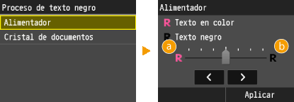 Si los resultados de copia del texto negro o ennegrecido no son los esperados, puede mejorar la reproducibilidad del color con este ajuste. El valor de este ajuste puede establecerse de forma independiente en el alimentador y en el cristal de la platina.
