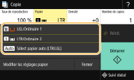 <Sélect papier auto (LTR/LGL)> n'est pas disponible lorsqu'aucun original n'est chargé dans le chargeur.