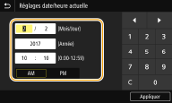Définissez <Fuseau horaire> avant de définir la date et l'heure courantes. Si le réglage <Fuseau horaire> est modifié, la date et l'heure actuelles refléteront cette modification.