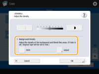 ![]() | You can adjust density of the background. This enables you to make clear copies of originals such as newspapers or originals with colored backgrounds. Adjusting the Density of the Background of Copies |