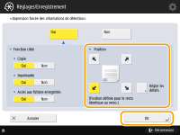 Appuyez sur les touches fléchées pour sélectionner la position d'impression. Pour ajuster précisément la position, appuyez sur <Régler les détails> et spécifiez la position.