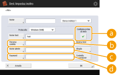 1 | Immettere il nome host del file server/<Area di condivisione> che trasmette i dati. ![]() Chiedere all'amministratore di rete le informazioni sul file server/Area di condivisione. <Protocollo>Selezionare un protocollo per il file server da <Windows (SMB)>, <FTP> e <WebDAV>. Per inviare un documento alla Area di condivisione, selezionare <Windows (SMB)> o <WebDAV>. ![]() Se si seleziona <Windows (SMB)>, vengono visualizzati i pulsanti <Ricerca host> e <Sfoglia>. È possibile specificare un file server/Area di condivisione con facilità cercando o visualizzando la rete. È possibile registrare fino a cinque server Directory utilizzati in <Sfoglia>. <Nome host>Immettere il nome host del file server/Area di condivisione. Se si seleziona <FTP> per il protocollo, inserire <Nome host> come segue. Quando TLS è disabilitato Esempio: Per salvare nello spazio condiviso: ftp://nome host/share Per salvare nello spazio personale: ftp://nome host/users Quando TLS è abilitato Esempio: Per salvare nello spazio condiviso: ftps://nome host/share Per salvare nello spazio personale: ftps://nome host/users Per inviare un documento alla Area di condivisione, immettere il <Nome host> come segue. Se si seleziona <Windows (SMB)> per il protocollo Esempio: Per salvare nello spazio condiviso: \\192.168.100.50\share Per salvare nello spazio personale: \\192.168.100.50\users Se si seleziona <WebDAV> per il protocollo Quando TLS è disabilitato Esempio: Per salvare nello spazio condiviso: http://<inidirzzo IP o nome host> Per salvare nello spazio personale: http://<indirizzo IP o nome host> Quando TLS è abilitato Esempio: Per salvare nello spazio condiviso: https://<indirizzo IP o nome host> Per salvare nello spazio personale: https://<inidirzzo IP o nome host> <Controllo connessione>Premere questo pulsante dopo aver immesso il nome host per confermare la connessione con il file server/Area di condivisione. ![]() Se si utilizza un servizio di accesso come la gestione dell'autenticazione personale, è necessario immettere <Nome utente> e <Password>. |