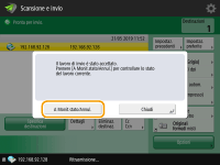 Per verificare il numero totale di destinazioni specificateIl numero totale di destinazioni specificate viene visualizzato in alto a destra della schermata. Ciò consente di verificare che il numero di destinazioni sia corretto prima dell'invio. ![]() Per annullare immediatamente un lavoro in corso di invioSe si preme (Stop) sul pannello di controllo durante l'invio di un lavoro, viene visualizzato il messaggio <Si vuole annullare il seguente lavoro di invio?>. Premere <Sì> per annullare l’invio.È possibile selezionare <Ultimo lavoro ricevuto> o <Lavoro in corso di invio> per scegliere il lavoro da annullare. <Lavoro da annullare alla pressione di Stop> Premere (Stop) in presenza di più lavori di invio per visualizzare la schermata di selezione del lavoro di invio da annullare. Se il lavoro di invio da annullare non è visualizzato, premere <Controllo altri lavori> per visualizzare <Lavori invio>. Selezionare il lavoro da annullare e premere <Annulla>.Per controllare gli stati dei documenti inviati e salvatiNella schermata <Monitoraggio stato/Annulla>, è possibile verificare gli stati dei documenti inviati/salvati. Questa schermata consente di inviare/salvare nuovamente i documenti oppure di annullare l'invio/salvataggio dopo la verifica degli stati. Controllo di stato e registro per i documenti acquisiti Se <Visualizzazione notifica ad accettazione lavoro> è impostato su <On>, la schermata <Monitoraggio stato/Annulla> potrebbe essere visualizzata dalla seguente schermata, visualizzata dopo la ricezione di un lavoro inviato. <Visualizzazione notifica ad accettazione lavoro> ![]() Per stampare il rapporto dei risultati di invio/salvataggioNella schermata delle funzioni di base per la scansione, se si preme <Opzioni> <Rapporto TX> è possibile impostare la stampa automatica del rapporto che elenca i risultati dell'invio/salvataggio.Per impostare per ogni lavoro da <Opzioni>, è necessario selezionare <Solo se errore> o <Off> in <Rapporto TX>, quindi impostare <Consentire stampa da Opzioni> su <On>. Nome fileQuando si invia/salva un file, il nome file viene automaticamente impostato in base al seguente formato. È possibile cambiare l'impostazione in modo da poter assegnare un altro nome. Impostazione di un nome di file Quando si invia per e-mail il formato "Numeri lavoro (quattro cifre)_numeri pagina (tre cifre).nome estensione file", ad esempio "1042_001.jpg" Quando si salva in un file server il formato "Anno, mese, giorno, ora, minuti e secondi di salvataggio del file (14 cifre).nome estensione file", ad esempio "20151030133541.jpg" Oggetto e-mailL'oggetto inserito in <Oggetto predefinito> viene impostato automaticamente (<Oggetto predefinito>). Se si specifica un oggetto diverso, modificare le impostazioni oppure specificare l'opzione ogni volta che si spedisce un'e-mail (Specifica delle impostazioni e-mail). Quando si alimentano più fogliLa scansione si arresta e viene visualizzato il messaggio sullo schermo. Seguire le istruzioni per rimuovere l'inceppamento. Dopo aver eliminato l'inceppamento, viene visualizzata la schermata di ripresa del lavoro. Se la macchina rileva erroneamente l'alimentazione di più fogli, premere <Non rilev.alim.più fogli da alimen.> per riprendere la scansione. Per impostare anticipatamente la macchina per la notifica dell'alimentazione di più fogli, eseguire una delle operazioni indicate. Ogni volta che si invia/salva, premere <Opzioni> nella schermata delle funzioni di base scansione selezionare <Rilev. alim. più fogli da alimen.> per disattivare l'impostazione.Impostare <Impost. rilev.alim. più fogli da alimentat. come default> su <Off> (<Impost. rilev.alim. più fogli da alimentat. come default>). |