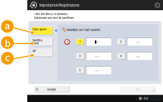 4 | Premere <Ora fine blocco in memoria> e specificare le informazioni necessarie. ![]() <Tutti i giorni>Impostare l'ora in cui finisce la ricezione della memoria. <Specifica giorni>Impostare il giorno della settimana e l'ora in cui la ricezione della memoria finisce. <Off>Selezionare questa impostazione se non si vuole impostare un'ora di fine per la ricezione della memoria.