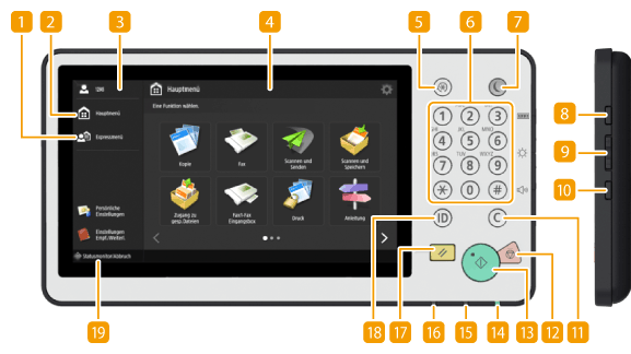 Mit dieser Taste kann der Status beim Drucken und Faxen überprüft oder der Verlauf der Gerätenutzung angezeigt werden. Sie können auch den Status des Geräts überprüfen, wie beispielsweise die verbleibenden Mengen von Papier und Toner oder ob Fehler auftraten.