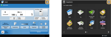 Drücken Sie  , das im Hauptmenü und auf dem Grundfunktionsbildschirm angezeigt wird, um den Bildschirm anzupassen, das heißt, um Tasten neu anzuordnen oder eine Schnelltaste anzulegen. Das Hauptmenüdisplay kann nur von einem Administrator angepasst werden. Anpassen des SensordisplaysSie können die Einstellungen im Bezug auf die Bildschirmanzeige ändern, wie beispielsweise der Bildschirm, der unmittelbar nach Einschalten des Geräts angezeigt wird, und ob die Meldung für verbleibende Papier- und Tonermenge erscheint. <Einstellungen Anzeige> |