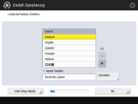 Wählen Sie die auf den Bildschirmen anzuzeigende Sprache aus. Je nach Sprache können Sie das Layout der Tastatur ändern, die zum Eingeben von Zeichen angezeigt wird. ![]() ![]() Wählen Sie die Sprache aus, und drücken Sie <OK>. Um das Tastaturlayout zu ändern, drücken Sie <Einstellen>, wählen Sie das Tastaturlayout, und drücken Sie <OK>. Die Anzeige der Schaltfläche für den Sprachwechsel ist praktisch, wenn die Sprache häufig umgestellt werden muss. Wechseln der angezeigten Sprache | |