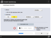 Stellen Sie das Datum und die Uhrzeit für das Gerät ein. ![]() ![]() Geben Sie Datum und Uhrzeit ein, und drücken Sie <OK>. Stellen Sie <Zeitzone> und <Sommerzeit> nach Bedarf ein. Weitere Informationen dazu finden Sie unter Einstellen von Datum/Uhrzeit. | |