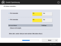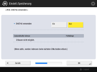 Legen Sie die Einstellungen für die Netzwerkverbindung fest. ![]() ![]() Drücken Sie <Ein> bei <IPv4 verwenden> oder <IPv6 verwenden> und anschließend <Weiter>. Sie können auch IPv4 und IPv6 verwenden. Wenn Sie <Aus> für <IPv4 verwenden> und <IPv6 verwenden> und dann <OK> drücken, überspringen Sie die Netzwerkeinstellungen und fahren Sie mit Schritt 9 fort. Wenn Sie <Ein> für <IPv4 verwenden> wählen, legen Sie die folgenden Einstellungen fest. ![]() Um die IP-Adresse automatisch abzurufen, drücken Sie <DHCP> oder <Auto IP> und anschließend <Weiter> oder <OK>. Um die IP-Adresse manuell festzulegen, löschen Sie die Auswahl für <DHCP> oder <Auto IP>, drücken Sie <IP-Adresse>, <Subnetmaske> und <Gateway Adresse>, um die jeweiligen Werte einzugeben, und drücken Sie anschließend <Weiter> oder <OK>. Weitere Informationen zu den IPV4-Adresseinstellungen finden Sie unter Einstellen einer IPv4-Adresse. ![]() Wenn Sie <Ein> für <IPv6 verwenden> wählen, legen Sie die folgenden Einstellungen fest. ![]() Drücken Sie <Ein>, um die zustandslose Adresse zu verwenden, bzw. <Aus> um die zustandslose Adresse nicht zu verwenden, und anschließend <Weiter>. Weitere Informationen zu den IPV6-Adresseinstellungen finden Sie unter Einstellen einer IPv6-Adresse. ![]() Nachdem Sie die zustandslose Adresse angegeben haben, legen Sie die folgenden Einstellungen fest. ![]() Drücken Sie <Ein>, um die manuelle Adresse zu verwenden, bzw. <Aus> um die manuelle Adresse nicht zu verwenden, und anschließend <Weiter>. Um die manuelle Adresse zu verwenden, drücken Sie <Manuelle Adresse>, <Präfixlänge> und <Standardrouter-Adr.>, um die jeweiligen Werte einzugeben. ![]() Nachdem Sie die manuelle Adresse angegeben haben, legen Sie die folgenden Einstellungen fest. ![]() Drücken Sie <Ein>, um DHCPv6 zu verwenden, oder <Aus>, um DHCPv6 nicht zu verwenden, und drücken Sie dann <OK>. | |