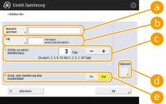 <Zeit bis zur automatischen Dateilöschung>Drücken Sie <->/<+>, um den Zeitraum zu ändern, bis die gespeicherten Dateien automatisch gelöscht werden. Die Dateien werden nicht gelöscht, wenn Sie "0" einstellen.