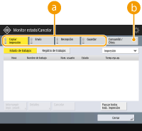 Si pulsa  (Monitor estado/Cancelar), aparecerá la pantalla <Monitor estado/Cancelar>. En esta pantalla, también puede consultar el estado de impresión y el estado de la transmisión, así como la cantidad restante de tóner y el nivel de memoria.