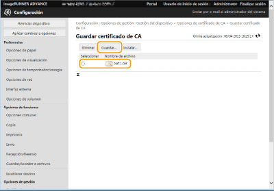 Seleccione el certificado de CA que desee registrar y haga clic en [Guardar...].