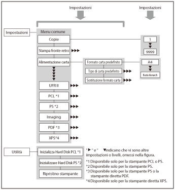 Dal menu Impostazioni stampante è possibile accedere alle funzioni comuni. La figura riportata di seguito illustra la struttura del menu Impostazioni stampante.
