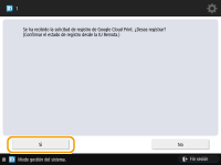 Es posible registrar el equipo desde un dispositivo móvil o Google Chrome. Antes de finalizar el registro, aparecerá la siguiente pantalla de confirmación en la pantalla del equipo. Pulse <Sí> para finalizar el registro.