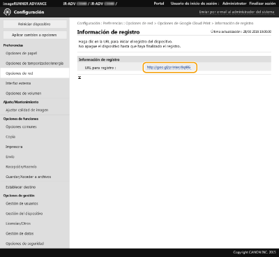 Haga clic en [Opciones de red]  [Opciones de Google Cloud Print].