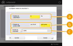 3 | Establezca la comunidad. ![]() <Comunidad dedicada>/<Nombre de comunidad 1>/<Nombre de comunidad 2>Para utilizar la comunidad seleccionada, pulse <Sí>. Si no desea utilizar la comunidad, pulse <No>. <Permiso de acceso a MIB>Para cada comunidad, seleccione los privilegios de acceso de MIB de <Lect./Escrit.> o <Sólo lectura>. <Nombre de comunidad>Introduzca el nombre de la comunidad a la que pertenece empleando caracteres alfanuméricos. Si selecciona <Establezca comunidad dedicada>, no podrá establecer un nombre de comunidad exclusiva. |