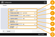5 | Introduzca la información necesaria. ![]() <Nombre de usuario>Introduzca un nombre de usuario usando caracteres alfanuméricos. ![]() No puede utilizar la palabra "Administrador" como nombre de usuario al registrarse. Si desea utilizar la palabra "Administrador", deberá establecer <Usar Administrator> a <No> en <Opciones de Administrator>. <Permiso de acceso a MIB>Seleccione los privilegios de acceso de MIB de <Lect./Escrit.> o <Sólo lectura>. <Opciones seguridad>Para establecer una combinación de autenticación y codificación, seleccione <Autent. sí/Cifrado sí>, <Autent. sí/Cifrado no> o <Autent. no/Cifrado no>. <Algoritmo autentic.>Seleccione MD5, SHA1 o SHA2 en función de su entorno. Para SHA2, escoja entre cuatro longitudes de hash (224 bits, 256 bits, 384 bits o 512 bits). <Contraseña autenticación>Introduzca una contraseña para utilizar para autenticación. Una vez introducida la contraseña, aparecerá <Confirmar> para pedir confirmación. Vuelva a introducir la contraseña. <Algoritmo de cifrado>Seleccione <DES> o <AES> en función del entorno. <Contraseña de cifrado>Introduzca una contraseña para utilizar para codificación. Una vez introducida la contraseña, aparecerá <Confirmar> para pedir confirmación. Vuelva a introducir la contraseña. |