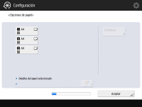 Compruebe que el papel cargado en los casetes está bien especificado. ![]() ![]() Si los tamaños del papel son correctos, pulse <Aceptar>. Para obtener información en pantalla e instrucciones sobre cómo cambiar las opciones, consulte Especificación del tamaño y tipo de papel en el casete. | |