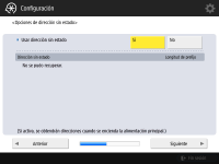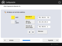 Especifique las opciones de la conexión de red. ![]() ![]() Pulse <Sí> para <Usar IPv4> o <Usar IPv6>, y pulse <Siguiente>. También puede utilizar IPv4 e IPv6. Si pulsa <No> para <Usar IPv4> y <Usar IPv6>, y pulsa <Aceptar>, omita las opciones de red y siga con el Paso 9. Si pulsa <Sí> para <Usar IPv4>, especifique las opciones siguientes. ![]() Para obtener la dirección IP automáticamente, pulse <DHCP> o <IP autom.>, y pulse <Siguiente> o <Aceptar>. Para configurar la dirección IP manualmente, quite la selección de <DHCP> o de <IP autom.>, pulse <Dirección IP>, <Máscara de subred> y <Dirección de puerta enlace> para introducir cada valor, y pulse <Siguiente> o <Aceptar>. Para obtener información sobre las opciones de la dirección IPV4, consulte Configurar una dirección IPv4. ![]() Si pulsa <Sí> para <Usar IPv6>, especifique las opciones siguientes. ![]() Pulse <Sí> para utilizar la dirección sin estado, o <No> para no utilizarla, y pulse <Siguiente>. Para obtener información sobre la dirección IPV6, consulte Configurar una dirección IPv6. ![]() Tras especificar la dirección sin estado, indique las opciones siguientes. ![]() Pulse <Sí> para utilizar la dirección manual, o <No> para no utilizarla, y pulse <Siguiente>. Para utilizar la dirección manual, pulse <Dirección manual>, <Longitud de prefijo>, y <Direc. enrutador prefij.> para introducir cada valor. ![]() Tras especificar la dirección manual, indique las opciones siguientes. ![]() Pulse <Sí> para utilizar DHCPv6 o <No> para no utilizar DHCPv6, y pulse <Aceptar>. | |