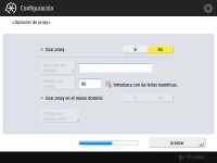 Especifique las opciones necesarias para utilizar el proxy. ![]() ![]() Para utilizar el proxy, pulse <Sí>, pulse <Dirección de servidor> y <Número de puerto> para introducir cada valor, y luego pulse <Aceptar>. Si configura <Usar proxy en el mismo dominio> como <Sí>, pulse <Configurar autenticación> para especificar las opciones de autenticación del proxy. Para obtener información sobre las opciones del proxy, consulte Configuración de un proxy. | |