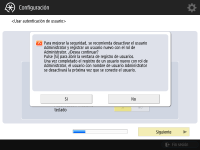 Para aumentar la seguridad del equipo, utilícelo en un sistema que emplee autenticación de usuario. ![]() Este equipo está configurado para emplear la autenticación de usuario como servicio de inicio de sesión. Para obtener más información, consulte Configurar las opciones de la administración de autenticación personal. ![]() Pulse <Sí> para <Usar autenticación de usuario>, pulse <Sí> para el método de inicio de sesión que se va a utilizar y pulse <Siguiente>. Si no emplea la autenticación de usuario, pulse <No> para <Usar autenticación de usuario>, pulse <Aceptar> y siga con el Paso 5. ![]() Indique las opciones siguientes si no hay administradores aparte del usuario "Administrador" registrado en el equipo. ![]() Si desea mejorar la seguridad del equipo deshabilitando el usuario "Administrador" y registrando un nuevo administrador, pulse <Sí>. En <Registrar Administrator>, introduzca <Nombre de usuario> y <Contraseña>, y pulse <Aceptar>. Especifique <Dirección de e-mail>, <ID dpto.> y <Mostrar nombre> según sea necesario. Para obtener más información, consulte Registrar la información de usuario en el dispositivo local. El usuario "Administrador" estará desactivado la próxima vez que inicie sesión. Para actuar como "Administrador", pulse <No>. ![]() ![]() Seleccione el momento en que desea mostrar la pantalla de inicio de sesión. Si selecciona <Mostrar si se selecciona Func>, pulse <Funciones>, seleccione la función de la que desea mostrar la pantalla de inicio de sesión y pulse <Bien>. Seleccione también los elementos de configuración de la pantalla <Configuración> de los que desea que se muestre la pantalla de inicio de sesión. Si selecciona <No> para <Autenticación mediante teclado>, pulse <Aceptar>. Diríjase al paso 5. Si selecciona <Sí> para <Autenticación mediante teclado>, pulse <Siguiente>. ![]() ![]() Para utilizar la autenticación a través de la entrada mediante solo teclas numéricas, pulse <Sí> y <Aceptar>. | |