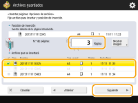 2 | Especifique el archivo para insertar y la posición donde insertarlo, y pulse <Siguiente>. ![]() Introduzca el número de página donde desea insertar el archivo mediante las teclas numéricas. |