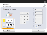 Appuyez sur <X> ou <Y> pour saisir la longueur de chaque côté avec le clavier numérique. ![]() Si vous enregistrez les formats de papier que vous utilisez fréquemment sur les touches <S1> à <S5>, vous pouvez les appeler en appuyant sur une seule touche. Enregistrement de papier de format libre (papier de format personnalisé) | |