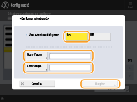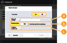 Premeu ací per configurar la informació d'autenticació quan s'utilitza la funció d'autenticació d'un servidor proxy. Premeu <On> a la pantalla mostrada, introduïu el nom d'usuari i la contrasenya per a l'autenticació del proxy i premeu <Acceptar>.