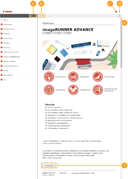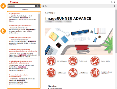 Näet napsauttamalla tietoja Käyttöopas -oppaan lukemisesta, hakujen suorittamisesta sekä muita tietoja.