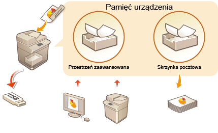 Możesz korzystać z urządzenia, jak z serwera plików zapisując dane w „Zaawansowana przestrzeń”, co umożliwia uzyskanie do nich dostępu z wielu komputerów. Przykładowo, zapisywanie zeskanowanych w Zaawansowana przestrzeń umożliwia udostępnienie danych informacji wszystkim pracownikom biura. Część Zaawansowana przestrzeń może być przypisana do danego użytkownika i nie będzie udostępniana publicznie.