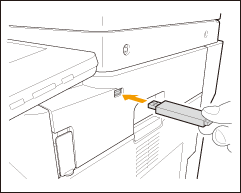 Certifique-se de que o dispositivo de memória USB está na posição correta quando o ligar à máquina. Se não for ligado corretamente, poderá provocar uma avaria no dispositivo de memória USB ou na máquina.