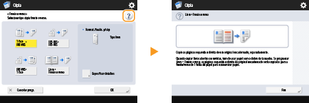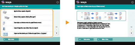 Carregue em <Iniciação> para apresentar um ecrã que indica o que pode fazer com as funções da máquina, bem como dicas que explicam como utilizar operações de cópia, leitura, etc. Consulte este ecrã quando quiser mais informações sobre as funções disponíveis e como utilizá-las.