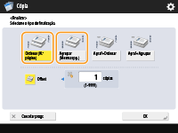 Ao copiar duas cópias ou mais a partir do alimentador, é possível selecionar a ordenação ou o agrupamento para a ordem das impressões. Selecione "Ordenar" para imprimir numa ordem de páginas sequencial. Selecione "Agrupar" para imprimir lotes de cada página como, por exemplo, 10 folhas para a primeira página, 10 folhas para a segunda página e assim sucessivamente.